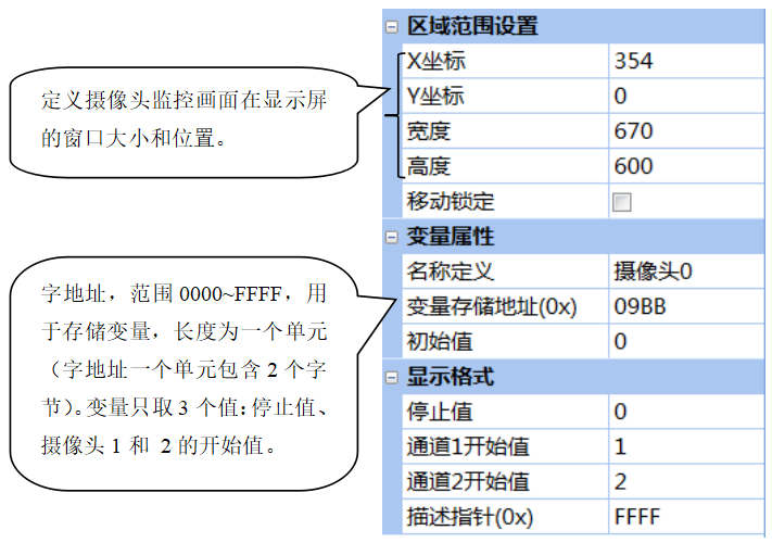 攝像頭控件是在顯示屏指定區域顯示攝像頭監控畫面。變量只有3個取值:停止值、攝像頭通道1的開始值、攝像頭通道2的開始值。當通過0x82指令向變量單元寫入開始值時,指定區域將播放攝像頭監控畫面;當寫入停止值時,視頻停止播放。