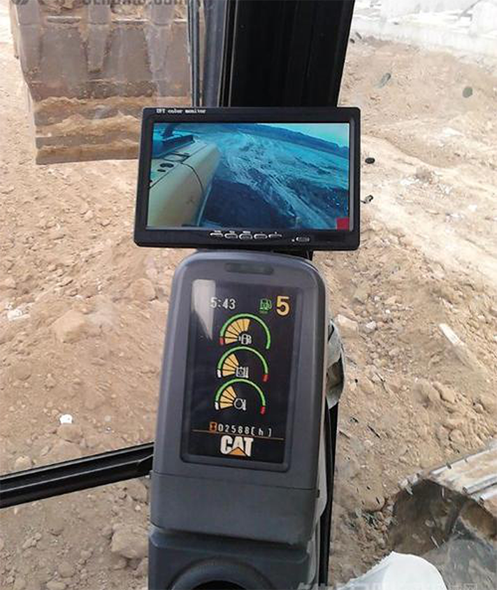 挖掘機、吊車等工程機械存在原地旋轉工況,而駕駛操作人員視線有限,出于安全考慮,必須借助攝像頭監控視線盲區。下圖為卡特一款挖機駕駛室照片,下方為挖機監控器,用于顯示挖掘機燃油油量、冷卻水溫、機油壓力等設備狀態參數,上方加裝的顯示屏用于連接攝像頭用于顯示駕駛員視線盲區場景。