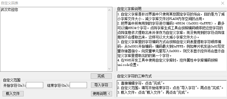 選擇所需字符集,即字庫的編碼方式。可選ASCII、BIG5、GB2312、GBK、SJIS、UNICODE。對于僅需要部分字符的字庫,用戶可自定義編碼表。詳細使用方法參考《多語種、大容量字庫的應用技巧.pdf》。 |