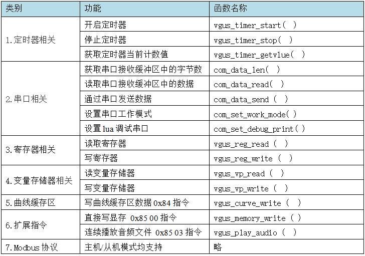 SDWb系列串口屏提供了多種API接口函數,用戶在回調函數里面,可以通過Lua腳本語言調用這些API接口函數,實現訪問串口屏內部的寄存器、變量存儲器、串口等硬件資源,還可以實現各種邏輯控制、算術運算、Modbus協議、自定義協議等功能。